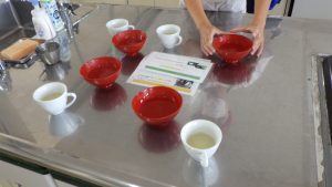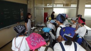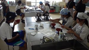 生徒たちはそれぞれのすまし汁をつくって試飲して、香りや色、味の違いなどを興味深そうに確かめ合っていました。