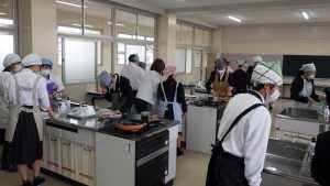 こちらは1年生の家庭科「調理実習」です。作っていたのは<豚肉のしょうが焼き>と<ほうれん草のごま和え>です。調理の過程で醸し出す良いにおいに、給食をたくさん食べたはずの筆者は空腹を覚えました。