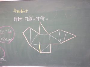 1年生の数学では「角錐・円錐の体積の求め方」の学習でした。